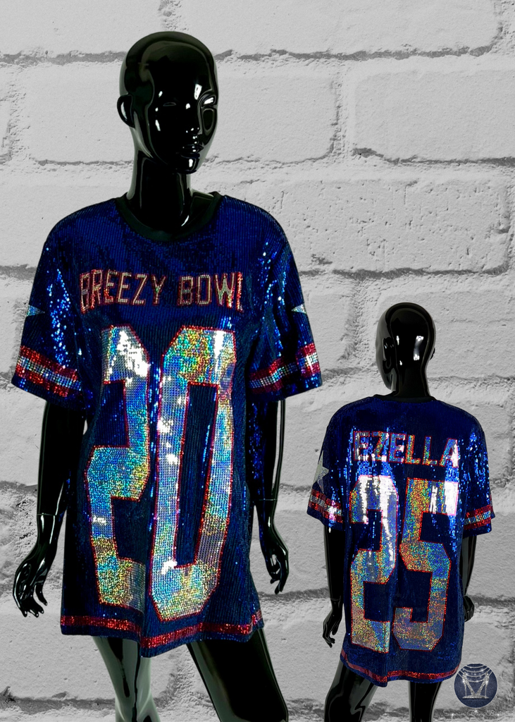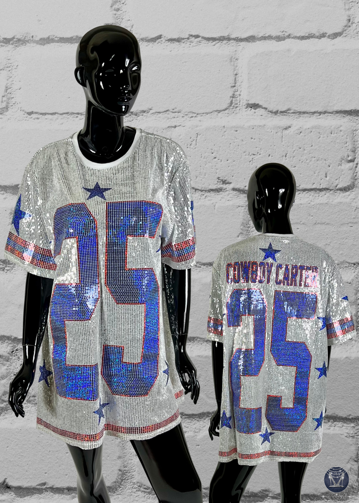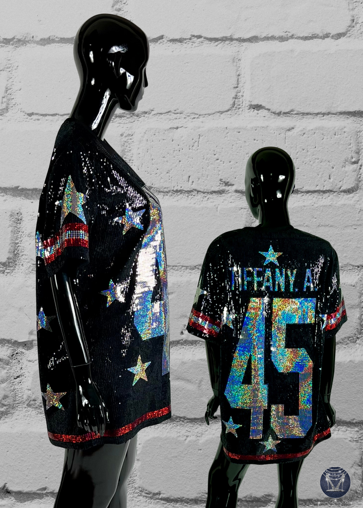 - Sequin Dress Back: Customize with your name/ text and number; (with scattered bling stars)