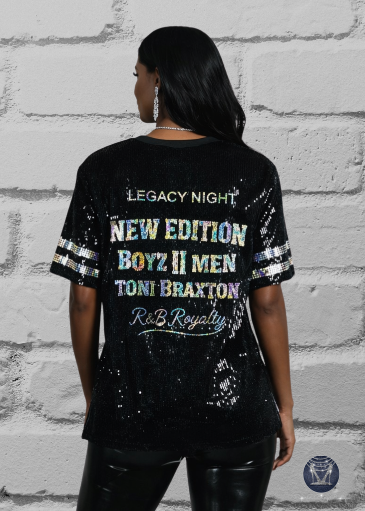 This sequin top features a dramatic high side slit for a sexy, confident fit and shimmering silver holographic spangle bling lettering that catches the light from every angle. Whether you’re headed to a concert, girls’ night out, or celebrating an iconic R&B era, this top delivers standout energy without being mass-produced.